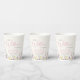 Elegant light cream paper cups for your baby girl shower featuring "a little wildflower is on her way" showcased in grey typography and a stylish pink script, and boho-inspired whimsical watercolors of dainty purple, pink and yellow wildflowers. Add the name of the mother-to-be in simple pink typography.