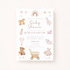 Diese Babydusche ist die perfekte Wahl für Eltern, die sich in sanften, natürlichen Farbtönen und einer warmen, gemütlichen Ästhetik verwöhnen lassen möchten. Mit feinen Illustrationen eines Teddybären, der Hase, der Babywagen, des Ballons und der Holzspielzeuge lädt das Hotel zu einem angenehmen und handgearbeiteten Charme ein. Die neutrale pastellfarbene Farbpalette in Beige, Blau und Braun ist ideal für alle Geschlechter. Ideal für rustikale, minimalistische oder moderne Babyduschen, fügt diese Einladung Ihrem besonderen Tag eine stilvolle, herzliche Touch hinzu. Machen Sie Ihre Babydusche mit diesem hübschen Boho-Design unvergesslich!