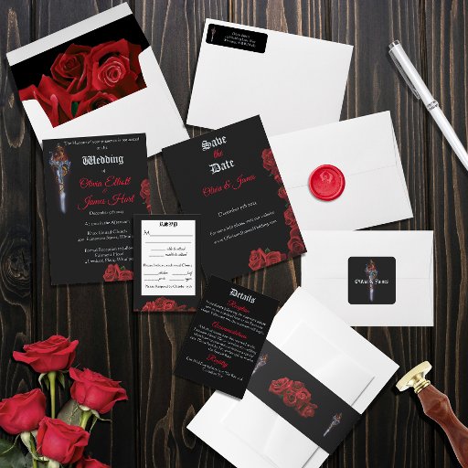 This bold fantasy wedding design features a dramatic red dragon coiled around an ornate silver sword, paired with deep red roses against a rich black backdrop. Perfect for couples who love gothic romance or medieval fantasy, this design blends intensity and elegance for a truly unforgettable wedding.
