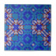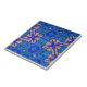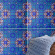 Das Design dieser Keramik-Kachel zeichnet sich durch symmetrische Muster aus, die einen harmonischen visuellen Effekt erzeugen. Die Kachel ist mit einer Reihe geometrischer Formen, darunter Diamanten und Sterne, geschmückt, die in einer komplexen, aber ästhetisch ansprechenden Weise verwoben sind. Die Farbpalette wird von verschiedenen Blautönen dominiert, von der coolen Ruhe des Türkisblau bis hin zur Marine. Diese Blues wird durch Touchs von Weiß und Rot wunderschön kontrastiert und verleiht dem Design ein Gefühl von Dimension und Lebendigkeit. Das Muster wiederholt sich, spiegelt sich sowohl horizontal als auch vertikal über die Kachel. Diese Wiederholung, kombiniert mit den unterschiedlichen Konturen jeder Form, macht das Muster Pop vor dem farbenprächtigen Hintergrund. Das Design der Kachel ist ein Beleg für die künstlerische Mischung aus zeitgenössischer geometrischer Ästhetik und traditioneller Mosaikkunst. Es ist ein Stück, das leicht als Brennpunkt in jedem Raum dienen kann, indem es eine Touch von Eleganz und Intrige mit seinem komplizierten Design und kühnen Farben hinzufügt.