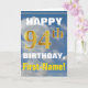 Dieses schlichte Geburtstagskarten-Design zeigt einen warmen Geburtstagswunsch wie "HAPPY 94. BIRTHDAY, Vorname!" auf der Vorderseite, in fett gedrucktem Text auf einem Hintergrund, der einen blauen Himmel mit weißen und grauen Wolken darstellt. Die Geburtstagsnummer hat ein goldfarbiges Aussehen von Imitaten/Imitationen. Der Name auf der Vorderseite kann angepasst werden. Im Inneren befindet sich eine Geburtstagsnachricht, die individuell angepasst werden kann. Eine solche Grußkarte könnte eine lustige Art sein, jemandem, der seinen vierundneunzigsten Geburtstag feiert, Geburtstagswünsche zu geben. [~Z0000284]