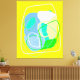 Ein Haufen gekrümmter Flugzeug und Linien in blau, grün und weiß vermischen sich auf der gelben Oberfläche dieses Gemäldes