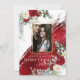 Ihr Foto Seasons' Greetings - Triple Gold Foto Rahmen - mit einem großen, fetten Farbstrich in einem metallischen Rot quer über die Seite und hinter dem Foto. Eukalyptus-Grünpflanzen und knallrote und Elfenbeincreme-Blume-Blumensträuße schmücken die Ecken. Design erstellt von © WhimsicalArtwork™ Individualisieren Sie Text, Schriftart Stil, Farbe und Größe. Wir haben diese Vorlage erstellt, um es Ihnen leicht zu machen, mit Ihren eigenen Informationen zu personalisieren. Dies ist Teil einer kompletten Hochzeitsgeschosse Suite mit passender Hochzeit, Babydusche und anderen Veranstaltungsportalen.