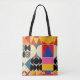 Grunge Tote Tasche mit einem auffälligen Modern Muster aus dem Mittelalter. Die Tasche weist ein einzigartiges geometrisches Muster auf, mit Spiralen, die ihr ein Gefühl von Bewegung und Energie geben. Die lebhafte Farbpalette verleiht dem Design eine Touch von Eleganz.