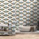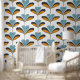 Retro-inspiriert Tapete mit fett geometrischen Blumenformen in Blau, Orange und Creme vor schwarzem Hintergrund. Ideal für moderne Innenräume, Akzent-Wände oder Statement-Stoffprojekte mit Vintagem 70er-Ambiente.