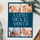 Modern Christmas theme birth announcement card featuring a bold typography text that says "a little miracle arrived" with 4 of your newborn pictures. This is a birth announcement card for the holiday seasons! Add your pictures, birth stats, and a message! The background is teal.