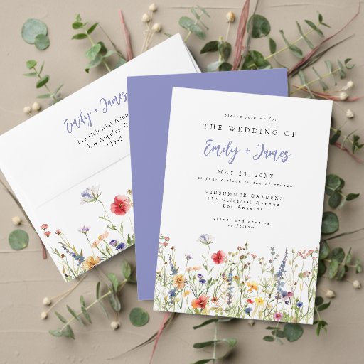 This collection features a colorful watercolor illustration of a vibrant rainbow of spring and summer wildflowers. Perfect for casual, outdoor, whimsical, and boho-inspired weddings.