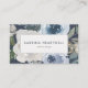 Das elegante Design der Visitenkarte besticht durch einen kühnen Boho-Bouquet mit blauen und weißen Blume und grünem Blattwerk auf dunkelblauem Hintergrund. Personalisieren Sie es mit Ihrem Namen und Titel in dunkelblauem Text auf einem weißlichen Rechteck. Fügen Sie auf der Rückseite Ihren Namen, Titel und Kontaktdaten hinzu.