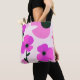 This bold floral tote bag features oversized green flower shapes set against a vibrant pink background.