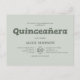 Feiern Sie diesen besonderen Meilenstein mit einer minimalistischen und eleganten Quinceñera Einladung. Die Überschrift "Quinceañera" wird in einem spielerischen Serif-Schriftart gerendert, während die Einzelheiten der Veranstaltung in einem raffinierten Serif-Schriftart liegen. Ideal für eine anspruchsvolle und fröhliche Feier.