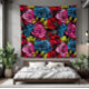 Ein gewagtes, maximalistisches Muster mit leuchtend roten, rosa und blauen Blumen, elektrisch grünen Blätter und grauem Gothic-Akzent.