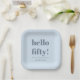 This personalized paper plate features a soft icy blue background with a bold “hello fifty” message and custom celebration details. Designed for milestone birthday parties, it works well for cocktail tables, bar setups, and casual seating areas. The cool dusty blue color coordinates easily with modern party décor. A functional detail that helps keep drink areas consistent throughout the celebration.