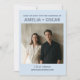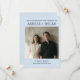 This custom save the date features a soft blue background with bold typography and your engagement photo. Says "SAVE THE DATE FOR THE WEDDING OF" at top with couple's names and photo in center. Bottom includes wedding date, city, and website. Customizable with your photo, names, date, location, and website. For couples who want modern, minimalist, bold save the date cards.
