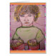 ein kleiner Junge, der Spielzeugbongos aus einer farbigen Bleistiftzeichnung spielt.
