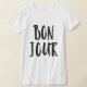 Diese niedlichen, modernen Ausrüstungsbeschreibungen die Wörter "bonjour" in der schwarzen modernen gebürsteten Beschriftung