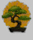 Eine schöne Abbildung eines Bonsai-Baumes, der in einem schwarzen Topf mit einem hellgelben, runden Hintergrund sitzt.
