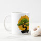 Eine schöne Abbildung eines Bonsai-Baumes, der in einem schwarzen Topf mit einem hellgelben, runden Hintergrund sitzt.