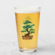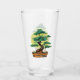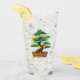 traditionelles Aquarelldesign eines japanischen Bonsai-Baumes vor hellgelber Sonne auf einem Trinkglas.