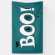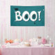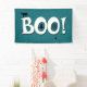 Boo! Textdesign zu Halloween mit Katz, Spinne, Eule und Spinnennetz Dekoration auf grunblauem Hintergrund.