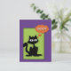Ein niedliches, schwarzes Kätzchen mit hellweißem Sprichwort "BOO" auf einem Kalkgrün und lila Hintergrund. Happy Halloween. Wenn Sie Hilfe benötigen CUSTOMIZIERUNG Ihrer Karte, frag bitte.