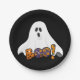 Freuen Sie sich auf diese von Halloween entworfene Papiertüte, die Ihre Familie und Ihre Freunde begeistern wird. Diese schwarze Platte verfügt über einen Geist und eine dekorative BOO! Ein niedlicher Teller für Halloween-Partys oder Erwachsene.