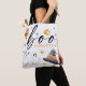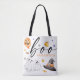 Diese Tasche macht die perfekte Trick- oder Beauty-Tasche, die mit einem Namen personalisiert werden kann. Die Einrichtung umfasst Gespenster, einen Hexenhut, einen orangefarbenen Kürbisballon und Bonbons.