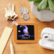 Halloween-Schlüsselanhänger zeigt eine Aquarellillustrierung eines lila Hexenhutes mit hängender Spinne und weißem "Boo!"-Text auf schwarzem Hintergrund
