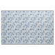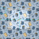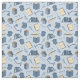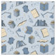 Blassblaue Stoffe mit einem coolen Muster aus blauen Büchern, Tischlampen und Lesebrille