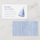 Ciao bambino! This enclosure card was made to match our "Ciao Bambino Italian Blue Boy Baby Shower" collection. This design features a hand-painted watercolor sailboat. Cards reverse to a pattern of vintage stripes in navy blue against a baby blue background. View the collection linked on this page for matching items or visit our store for more baby shower enclosure cards.