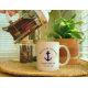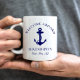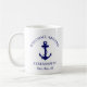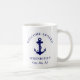 Eine schicke, moderne nautische Tasse mit marineblau-blauem Anker. Sie können den Text "Welcome Abard" und den Namen und die Lage Ihres Bootes in eleganter marineblauer Typografie personalisieren.