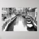Ein Schwarz-Weiß-Foto von Booten, die an einem Kanal in der italienischen Stadt Venedig verbunden sind.