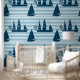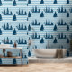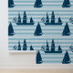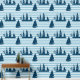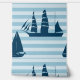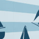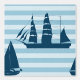 Blaue horizontale Streifen stehen für Meereswellen mit silhouetted dunkelblauen Segelbooten und Schiffen.