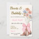 The Boots and Bubbly bridal shower invitation is designed with brown cowgirl boots, a pink bow, colorful flowers, pink, brown, and black text, and a tan background.