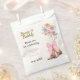 The Boots and Bubbly favor bags for the bridal shower feature brown cowgirl boots, a pink bow, colorful flowers, pink, brown, and black text, and a tan background.
