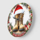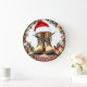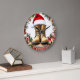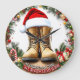 This rustic and sentimental clock features a pair of tan work boots wearing a Santa hat, standing on a wooden plank floor. The boots are surrounded by a wreath of pine boughs, candy canes, pinecones, and wrapped gifts. The text across the bottom reads, "AT CHRISTMAS TIME, ALL ROADS LEAD HOME." The design may look real due to the high detail and three-dimensional texture in the artwork.