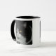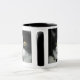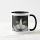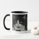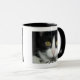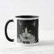 Schwarzweiss-Katzenschale mit schwarzer Kante und Griff.