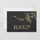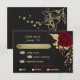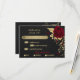 Schöne, individuell anpassbare botanische Rsvp-Karte mit Speisekarte schöne dunkelrote Blume mit goldenen Blätter vor elegantem schwarzem Hintergrund