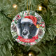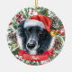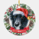 Dieses raffinierte Weihnachtsschmuck der Border Collie Keramik zeigt ein hübsches Aquarellbild eines Schwarz-Weiß-Border-Collie-Hundes in einer Weihnachtsmannmütze, umgeben von Urlaubspflanzen, Pinecones und Beeren, mit einem roten Banner mit dem Namen Ihres Haustieres (oder Wechsel zu frohen Weihnachten). Sie können dieses Design vollständig personalisieren, indem Sie den Gruß und das Jahr auf der Rückseite in einem eleganten Schriftart ändern. Das stilvolle Weihnachtsschmuck ist perfekt für Border Collie Liebhaber, Herdenhundefreunde, Hundefreunde und Liebhaber von Haustieren.