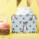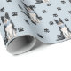 Ein Bild eines Border Collie Dog ist das Merkmal dieses jedes Anlasses Geschenkpapier. Der Hund trägt eine blaue Bogen-Krawatte inmitten eines schwarzen Pfotenmusters und wird auf einem silberblauen Hintergrund wiederholt.