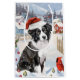 Dieses festliche Design spiegelt den fröhlichen Geist der Urlaubssaison wider und besticht durch ein hübsches Jungtier mit einer Weihnachtsmannmütze. Der Hund ist eingebettet in ein winterliches Wunderland, mit einem Schneemann, einem dekorierten Weihnachtsbaum und wunderschön verpackten Geschenken. Schneeflocken fallen sanft ab und geben der Szene eine magische Touch, während die lebhaften Farben der Feriendekorationen eine warme und fröhliche Atmosphäre schaffen.