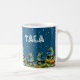 Border Collie in Winter Snow Forest Weihnachtsbaum Tasse. Ruhige Winterschneelandschaft mit einer schönen schwarz-weißen Grenzkolonie und farbenfrohen Weihnachtsbäumen. Hundes Name ist in einem trendigen und lustigen Schriftart. Schöne personalisierte Kaffee-Tasse. Personalisieren Sie den Namen.