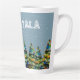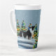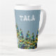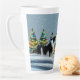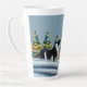 Border Collie in Winter Snow Forest Weihnachtsbaum Latte Tasse. Ruhige Winterschneelandschaft mit einer schönen schwarz-weißen Grenzkolonie und farbenfrohen Weihnachtsbäumen. Hundes Name ist in einem trendigen und lustigen Schriftart. Schöne personalisierte Latte Tasse. Personalisieren Sie den Namen.
