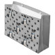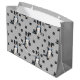 Ein Bild eines Border Collie Hundes ist die Eigenschaft in diesem jeden Anlaß Geschenktasche. Der Hund trägt eine blaue Bogen-Krawatte inmitten eines schwarzen Pfotenmusters und wird auf einem silbergrauen Hintergrund wiederholt. Beide Seiten des Beutels haben das gleiche Muster.