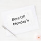Starten Sie Ihre Woche mit einer Dosis Sarkasmus und einem Sprinkle Spaß! Unsere "Bore Off Monday" Aufkleber sind die ideale Ergänzung für die Montag-Blues. Diese Aufkleber sind mit einem weichen Rand gefertigt und verleihen Ihrem Laptop, Ihrer Wasserflasche oder Ihrem Bürobereich eine Touch von rebellischem Charme.