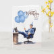 Ein Geschäftsmann in einem blauen Anzug sitzt an einem Schreibtisch in einem Büro mit einem Blumenstrauß, trägt einen Hut aus Party und lächelt auf dieser Geburtstagskarte für einen männlichen Chef.