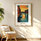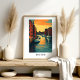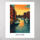 Illustrated poster of Boston's harbor at sunset with brick buildings, calm water reflections, and white sailboats docked along the pier.
