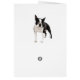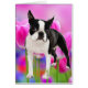 Schwarz und Weiß Boston Terrier auf einem Hintergrund von rosa Tulpen.