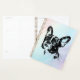Einfache Schreibweise eines Boston Terrier Hundes. Das elegante Design der schwarz-weißen Skizze auf subtilem Regenbogen-Hintergrund.