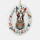 Dieses niedliche Holiday-Ornament besticht durch ein Aquarellbild eines Schwarz-Weiß-Boston Terrier-Hundes, der in seinem Winterpulli und Hut gekleidet ist. Das Bild ist in einem farbenfrohen Kreiskranz gerahmt, der aus verschiedenen Holiday-Bildern besteht, darunter ein Schneemann, Glocken, Bonbons, Strumpf, Heilige und vieles mehr! Die Rückseite des Ornaments hat das gleiche Kranzbild mit Ihrem benutzerdefinierten Text in Grün, Gold und Rot.