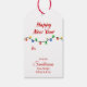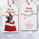 An der Vorderseite dieses Holiday Geschenketiketts ist ein Bild eines niedlichen Boston Terrier Hundes in einer rot-weißen Weihnachtsgeschenktüte. Hinter dem Hund befindet sich eine Reihe farbenfroher Urlaubslichter. Im Text oben steht "Frohe Weihnachten". Die Rückseite des Tags wiederholt das Bild der Holiday-Lichter, mit Textfeldern in rot, die Sie anpassen können.